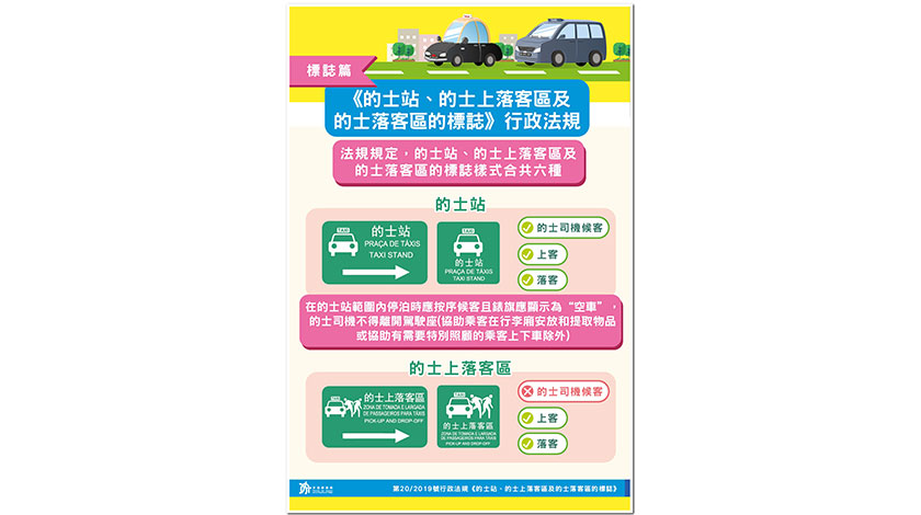 為方便的士業界及市民瞭解三項行政法規詳情,交通事務局以鮮艷的色彩、活潑的圖像及簡要的文字制作了相關圖文包,並已上載至交通事務局網頁www.dsat.gov.mo,歡迎瀏覽及下載。