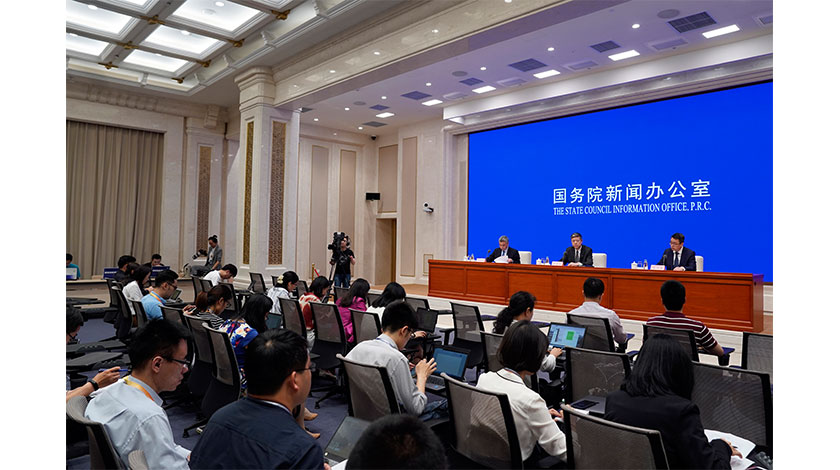 6月4日,文化和旅遊部新聞發言人喻劍南(臺上右一)在北京舉行的國新辦發佈會上表示,近期,美國槍擊、搶劫、盜竊案件頻發,對此,文化和旅遊部發布中國遊客赴美旅遊安全提醒。(新華社記者 金良快 攝)