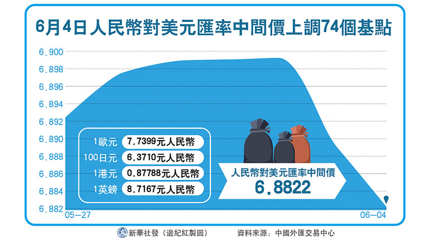 圖表:6月4日人民幣對美元匯率中間價上調74個基點新。(華社發 邊紀紅 製圖)