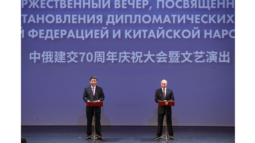 當地時間6月5日,中國國家主席習近平和俄羅斯總統普京在莫斯科大劇院共同出席中俄建交70周年紀念大會並觀看文藝演出。(中新社圖片/盛佳鵬 攝)