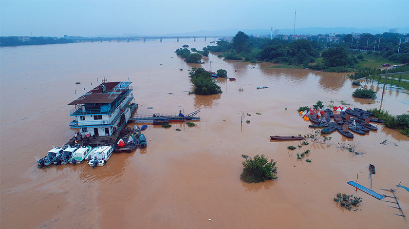 6月12日,航拍江西省吉安市泰和縣贛江段,受持續強降雨影響,贛江水位上漲,已超過警戒線。截至當日16時30分統計,6日下午開始的洪澇災害,導致該省9個設區市80個縣(市、區)260.5萬人受災,直接經濟損失56.2億元人民幣。(中新社圖片/ 鄧和平 攝)