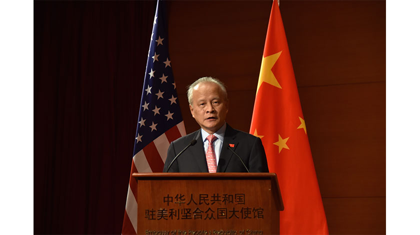 當地時間7月31日晚,中國駐美國大使館在華盛頓舉行慶祝中國人民解放軍建軍九十二周年招待會。圖為中國駐美大使崔天凱致辭。(中新社圖片/ 沙晗汀 攝)