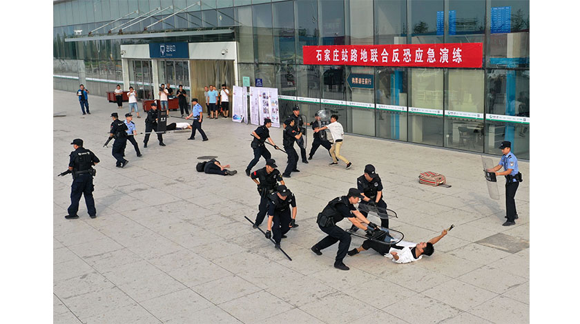 8月6日下午,在河北定州東站,一場『暴徒駕車衝撞站前馬路行人後,又下車持刀砍殺廣場旅客』的模擬反恐演練正在展開。為有效提昇民警反恐應急處突能力、築牢鐵路運輸安全屏障,北京鐵路公安局石家莊公安處保定東站派出所聯合當地公安機關、120急救等部門聯合開展反恐應急處突模擬演練。圖為反恐演練現場。(中新社圖片/翟羽佳 攝)