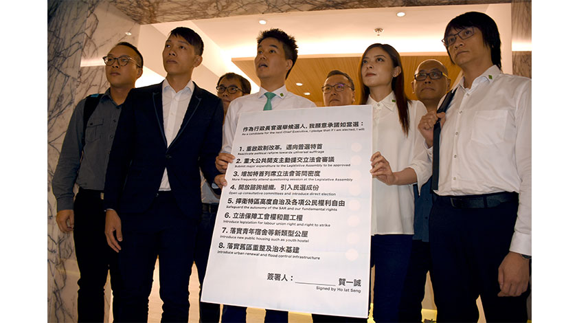 昨日,新澳門學社準備大型紙牌,列出八項訴求,希望賀一誠承諾及簽署。然而,競選辦不容許他們帶進會面場地。蘇嘉豪希望賀一誠當選後變得開放、擴闊胸襟、減少限制,這可顯示管治自信。若如現任特首需要十多名警員保護才能落區,其實是顯示沒有自信。