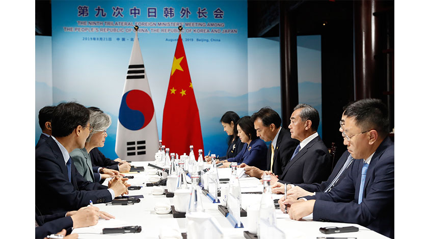 8月20日,中國國務委員兼外長王毅在北京會見來華出席第九次中日韓外長會的韓國外長康京和。(中新社圖片/ 韓海丹 攝)