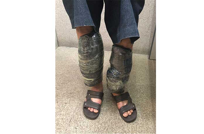 本月4日下午,關閘口岸關員於入境旅客檢查區執勤時,發現一名男子步履蹣跚,經檢查發現其斜揹袋、手持的膠袋及小腿位置綁纏物品偷運入境,最終共搜獲豬內臟7.3公斤及香煙40支。涉案的本澳男子,年約65歲,報稱無業,海關已根據《對外貿易法》之相關規定對其作出起訴,一經判罰,可科處澳門幣5千元至10萬元罰款,而被查獲的貨物亦會宣告歸澳門特別行政區所有。