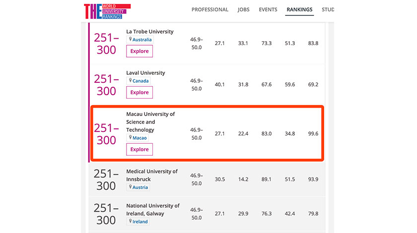 澳科大首度躋身世界大學排名前三百