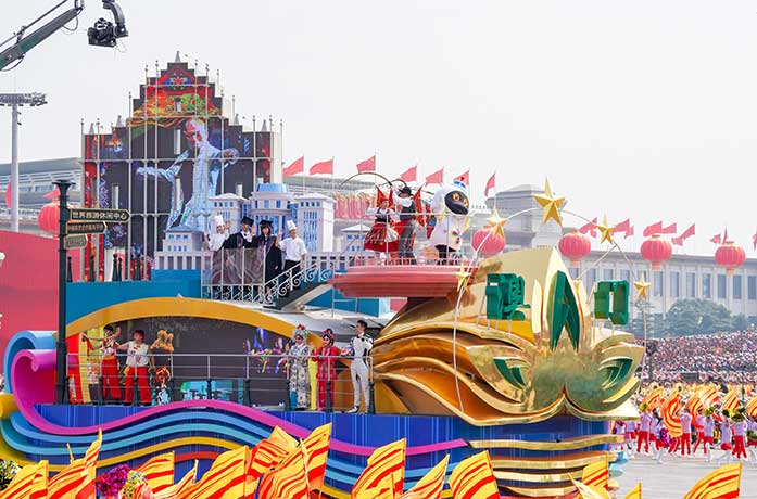 當日,澳門旅遊吉祥物麥麥與多個領域的澳門人士匯聚在花車上,表現多元文化共融共處,包括:賽車運動領域、高等教育領域、廚師領域、澳門非物質文化遺產領域、澳門土生文化領域和節慶領域等,一同向現場和觀看直播的觀眾送上來自澳門的祝福,共同分享國慶喜悅,展現出澳門的熱情和魄力。