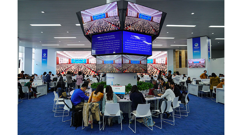 11月5日,第二屆中國國際進口博覽會在上海開幕。圖為眾多中外記者在進博會主新聞中心內緊張忙碌。(中新社圖片/ 崔楠 攝)