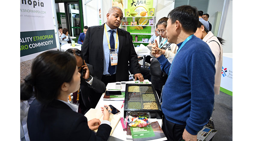11月6日,在上海舉行的第二屆中國國際進口博覽會上,一位中國買家向埃塞俄比亞參展商詢問農產品情況。(中新社圖片/毛建軍 攝)