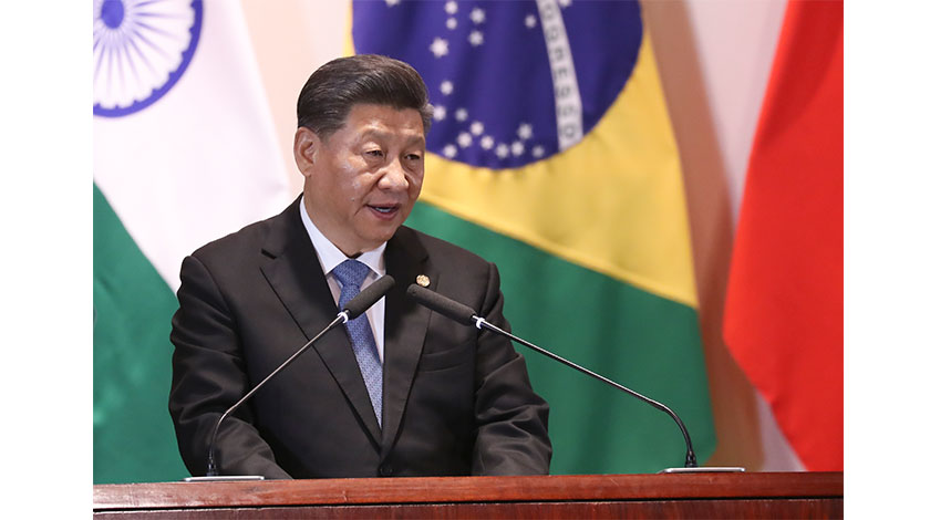 當地時間11月14日,金磚國家領導人同金磚國家工商理事會和新開發銀行對話會在巴西利亞舉行。中國國家主席習近平、巴西總統博索納羅、俄羅斯總統普京、印度總理莫迪、南非總統拉馬福薩共同出席。五國領導人聽取了金磚國家工商理事會、新開發銀行代表工作匯報、接受工商理事會代表遞交年度工作報告,並分別發表講話。圖為中國國家主席習近平發表講話。(中新社圖片/杜洋 攝)