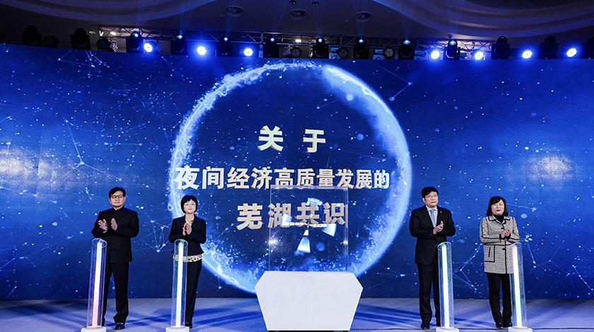11月16日,經中國文化和旅遊部批准,由中國旅遊研究院、蕪湖市人民政府、深圳市名家匯科技股份有限公司共同主辦的2019中國夜間經濟論壇在蕪湖舉行。圖為論壇現場發佈『關於夜間經濟高質量發展的蕪湖共識”。(中新社圖片/王迎濤 攝)