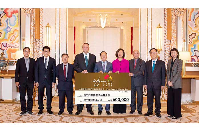 上代表永利將有關支票致送予澳門日報讀者公益基金會,並由該基金會理事長黃國勝、副理事長許建章、崔家榮、黃嘉豪、黃健中及理事李永順代表接受。