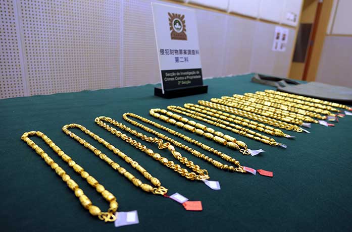 司警聯同治安警公布,五名菲律賓男女為朋友關係。於本月十八日組成盜竊集團並乘機到本澳,入住中區一賓館。五人於十九日上午到中區一帶尋找目標,至下午一時十九分議定進入友誼大馬路一間珠寶店。各人佯裝顧客分散要求職員出名錶或金飾查看。另外兩名菲律賓男女伺機打開店舖近門口的飾櫃,取走一盤共有十四條金錬飾盤逃走。有職員發覺追出已失去蹤影。店內其餘菲男亦趁機離去。職員報案損失五十四萬一千元。
