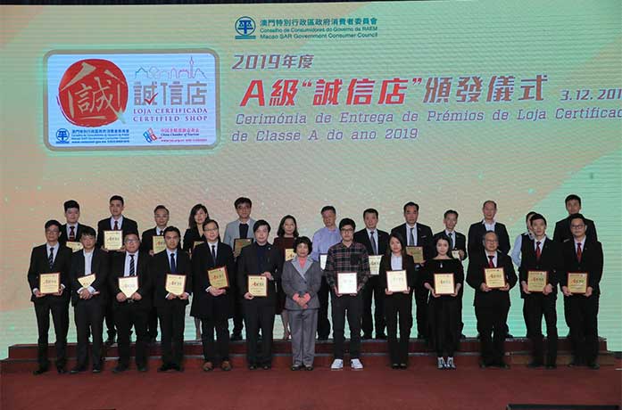 消委會於12月3日舉行頒發2019年度A級「誠信店」儀式及公佈商號名單,儀式上,同時向符合「星級旅遊服務認可計劃」聯乘「誠信店優質標誌計劃」條件的商號授予「星級服務商戶獎」,消委會及旅遊局相信透過這次的合作,對加強消費維權的保障,以及提升澳門旅遊零售服務文化可達致最大的協同效益。