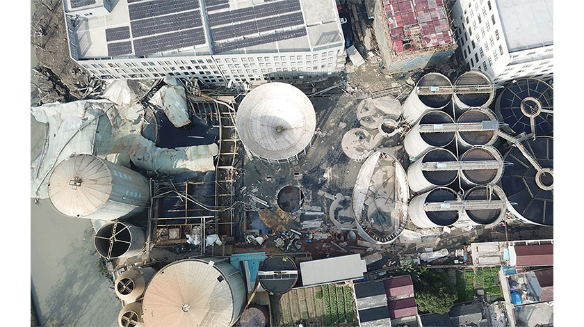 12月4日,航拍海寧污水罐體倒塌現場。3日17時19分,浙江省海寧市許村鎮蕩灣工業園區海寧市龍洲印染有限責任公司污水厭氧罐倒塌,造成人員被困。據海寧市政府新聞發佈會最新通報,截至目前,該事故共造成9人死亡,另有4名重傷員送醫救治,已知失聯人員全部找到。 (中新社圖片/蔡自鑫 攝)