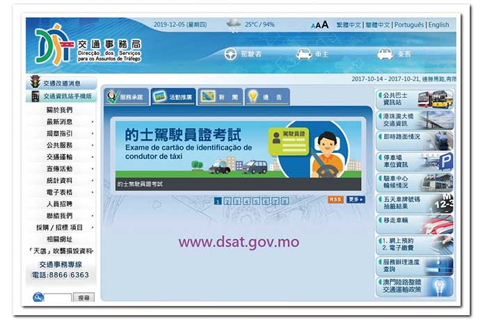 交通事務局已於官方網頁www.dsat.gov.mo建立模擬的士駕駛員證考試測試版本,以供報考人士瞭解及熟練相關電子考試模式。