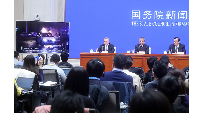 12月9日,中國國務院新聞辦公室在北京舉行新聞發佈會,新疆維吾爾自治區黨委副書記、自治區主席雪克來提•扎克爾,新疆維吾爾自治區黨委常委、烏魯木齊市委書記徐海榮,新疆維吾爾自治區黨委常委、自治區副主席艾爾肯•吐尼亞孜,新疆喀什地委副書記、喀什地區行署專員帕爾哈提•肉孜介紹新疆穩定發展有關情況,並回答記者提問。圖為發佈會現場播放暴力恐怖犯罪視頻。(中新社圖片/張宇 攝)