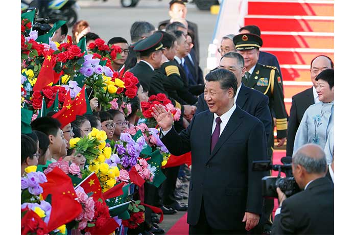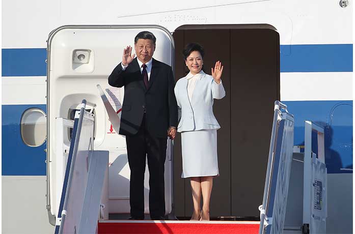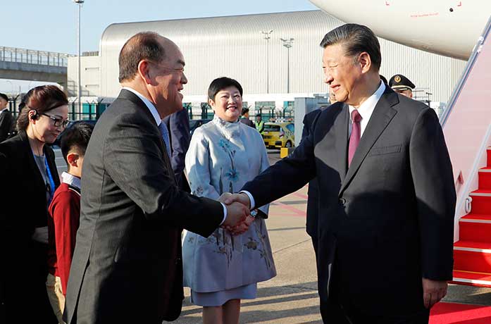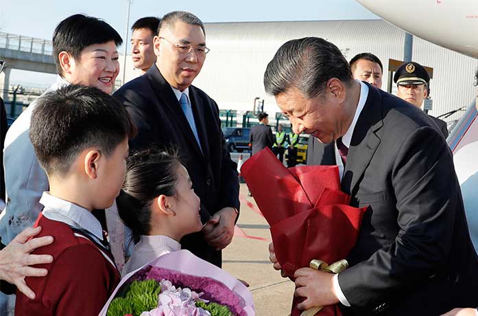 當日16時許,習近平乘坐的專機徐徐降落在澳門國際機場。習近平和夫人彭麗媛走出艙門,向歡迎人群揮手致意。澳門警察樂隊奏響熱情喜慶的歡迎曲,現場一片歡騰。舷梯旁,兩名澳門少年兒童向習近平和彭麗媛獻上鮮花。在澳門特別行政區行政長官崔世安和夫人霍慧芬陪同下,習近平和彭麗媛同前來迎接的人員親切握手。