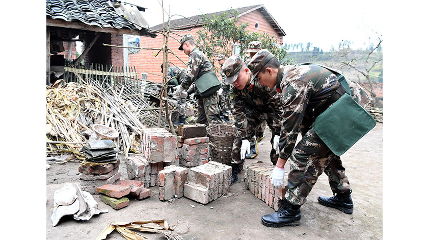 12月18日8時14分,四川省內江市資中縣發生5.2級地震,震源深度14千米,震中位於內江市資中縣陳家鎮。內江市應急管理局通報的最新核查情況顯示,截至18日14時,本次地震共造成10人受傷,其中重傷4人,均已送醫院治療。地震受災人口339人,房屋倒塌2間、嚴重損壞39間、一般損壞30間,直接經濟損失初核為103.9萬元人民幣。資中市共出動各類救援力量2607人,目前人員搜救工作已基本結束。圖為武警官兵在排查房屋安全隱患。(中新社圖片/安源 攝)
