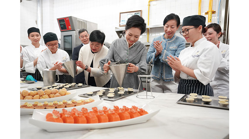 在學院教學餐廳,彭麗媛觀看了「澳門美食之都」短片和茶藝表演,對學生們製作的特色糕點表示讚許。彭麗媛和教師、學生親切交談,鼓勵同學們努力學好專業知識和技能,為粵港澳大灣區建設和中西文化交流作出自己的貢獻。