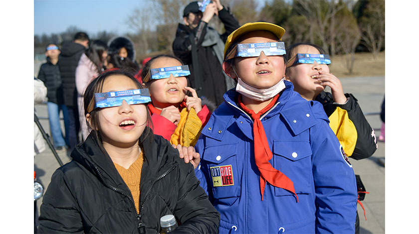 12月26日,山西太原,小學生戴目鏡觀測日偏食。當日,一場日環食奇觀現身天宇。由於不處在環食帶內,中國全境祗能看到不同程度的日偏食。(中新社圖片/武俊傑 攝)