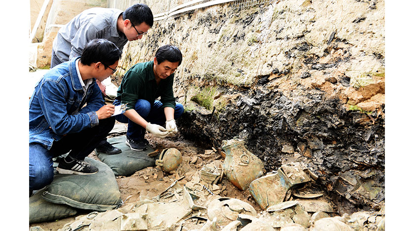 12月30日,秦始皇帝陵博物院透露,該院對秦陵外城西側的陵區展開了詳細的考古調查與勘探工作,發現古代墓葬20多座,灰坑120座,陶窑4座,古河床4條。新發現墓葬陪葬坑14座。其中,已發掘的一座墓葬出土了目前中國所見最早的單體金駱駝。此次發現有9座大型墓葬,東側4座為中字形,靠近秦始皇帝陵;西側5座為甲字形,距秦陵稍遠。同時,在最西側一組三座甲字形墓葬四周發現一圈完整壕溝,呈『目』字形。這是目前秦陵地區發現的獨一無二、規模最大、保存最完整的帶壕溝的墓葬遺存。資料圖為工作人員在考古現場。(中新社圖片/ 秦始皇帝陵博物院供圖 攝)