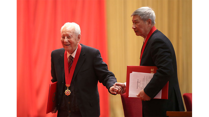 1月10日,中共中央、國務院在北京隆重舉行國家科學技術獎勵大會。原中國船舶重工集團公司第七一九研究所黃旭華院士(左)和中國科學院大氣物理研究所曾慶存院士獲得2019年度國家最高科學技術獎。(中新社圖片/盛佳鵬 攝)