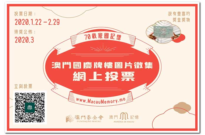 為與市民分享徵集成果,增加大眾對國慶牌樓的認識與關注,「澳門記憶」特設「澳門國慶牌樓圖片徵集」網上投票,投票日期由1月22日起至2月29日,有興趣的市民只需註冊成為「澳門記憶」文史網之VIP會員,即可於投票頁面投選心儀圖片,投票規則詳見網上章程。