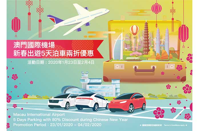 【特訊】為迎接農曆新年的來臨並與旅客歡度喜氣洋洋的新春佳節,由2020年1月23日至2020年2月4日,凡於澳門國際機場出遊的旅客可享最多連續5日泊車2折優惠,優惠適用於澳門國際機場南面及北面停車場。旅客無需預約登記,只需從澳門國際機場出發,于繳費處出示其本人之有效旅行證件、來回登機證及泊車票,即可獲得折扣優惠。停車位數量有限,優惠先到先得。