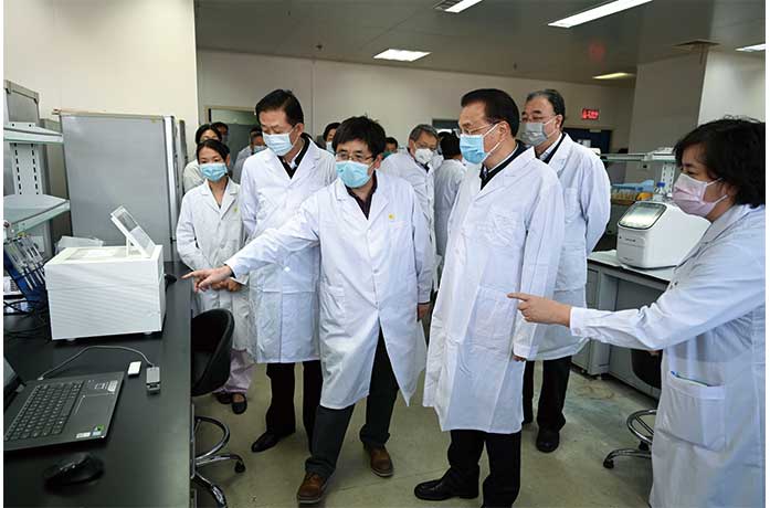 1月30日,中共中央政治局常委、國務院總理、中央應對新型冠狀病毒感染肺炎疫情工作領導小組組長李克強赴中國疾控中心考察疫情防控科研攻關情況,聽取專家和醫務人員對疫情防控工作的意見建議。圖為李克強來到疾控中心病毒所實驗室考察。 (中新社圖片/ 劉震 攝)