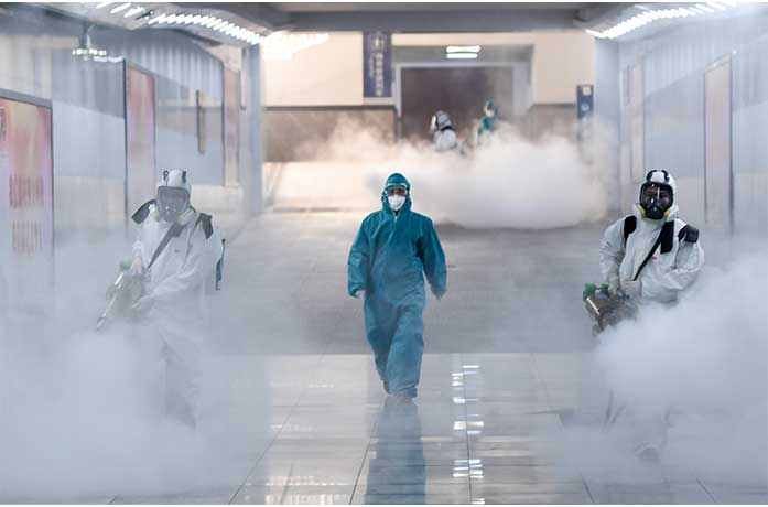 2月4月,為應對新型冠狀病毒感染的肺炎疫情,十餘位來自長沙藍天救援隊的志願者手持重型消毒機器,對長沙火車站內外進行消毒殺菌。 (中新社圖片/ 楊華峰 攝)