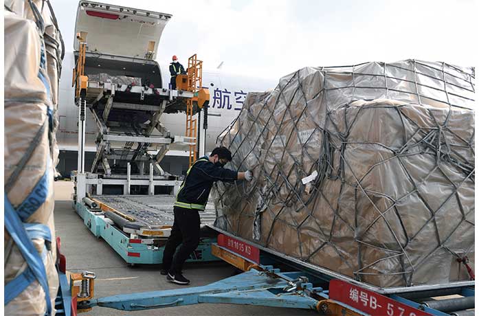 2月5日,工作人員將華僑華企捐贈的物資從飛機上卸下。當日,由菲律賓中國商會、菲華各界聯合會、菲律賓浙江總商會等僑團和社會組織籌措的200余萬個口罩及數萬件防護服等防疫物資抵達浙江杭州,為戰勝疫情貢獻力量。 (中新社圖片/ 李晨韵 攝)