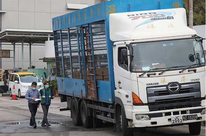 近日,香港市面持續出現搶購潮,有媒體及網絡傳出負面聲音指貨運通關受阻。2月7日,香港中通社記者前往文錦渡管制站附近觀察,發現口岸運作暢順,貨車通關如常,物品供應未斷。圖為當日,由內地送往香港的活雞運輸車輛在文錦渡牲畜檢疫站進行防疫檢查。(香港中通社)