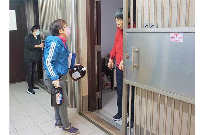 中心日前更得到社會熱心人士關愛住戶,送贈消毒水,主任梁桂萍、副主任馮淑婷、社工孔惠榕、物理治療師李永雄以及數名職員馬不停蹄,逐一上門,藉著元宵佳節,向長者送上節日祝福,同時加強防疫教育,堅守防疫關鍵期,呼籲不外出、不聚會,如非要外出需戴好口罩,在家勤清潔和洗手。