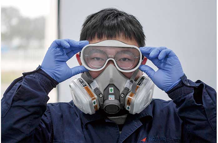 2月10日,湖南長沙,工作人員演示戴3D打印的醫用護目鏡。當日,湖南雲箭集團增材製造事業部製造的首批3D打印醫用護目鏡正式交付使用,馳援抗疫一線。該3D打印技術生產的醫用護目鏡,重量祗有普通護目鏡的四分之三,還可根據個人面部數據實現私人化定製。 (中新社圖片/ 楊華峰 攝)