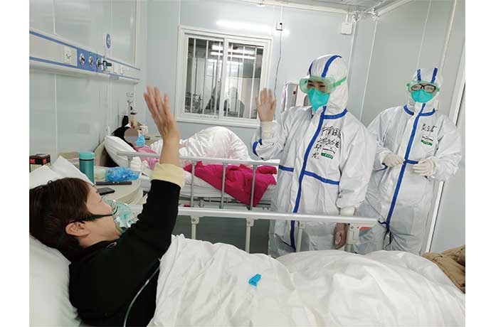 2月9日晚,武漢雷神山醫院接收了第二批新冠肺炎患者,總入住患者達80餘人。雷神山醫院位於武漢江夏區黃家湖畔,是武漢新建的第二座集中收治新冠肺炎患者的專門醫院,由武漢大學中南醫院接管,于8日正式啟用。圖為醫護人員為患者鼓勁加油。 (中新社圖片/ 高翔 攝)