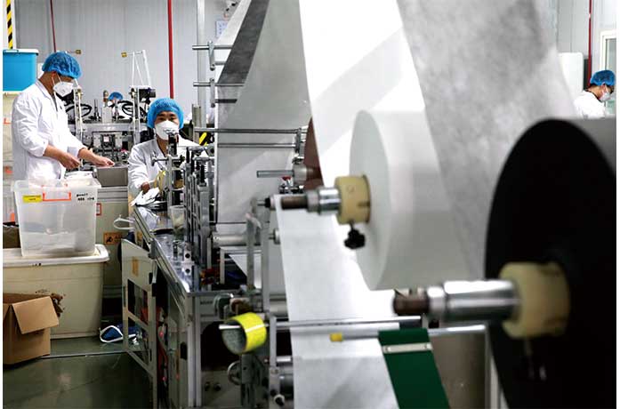 2月12日,濟南一口罩生產企業“火力全開”保供應,自1月22日開始24小時滿負荷生產,日產KN95級別口罩約3萬隻,全部供當地政府統一調配。疫情當前,作為中國口罩生產大省,山東正開足馬力以日產200余萬隻的產能生產,佔中國口罩總產能的十分之一。 (中新社圖片/ 梁犇 攝)