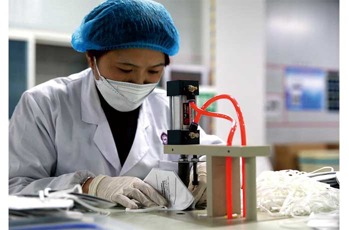 2月12日,濟南一口罩生產企業“火力全開”保供應,自1月22日開始24小時滿負荷生產,日產KN95級別口罩約3萬隻,全部供當地政府統一調配。疫情當前,作為中國口罩生產大省,山東正開足馬力以日產200余萬隻的產能生產,佔中國口罩總產能的十分之一。 (中新社圖片/ 梁犇 攝)
