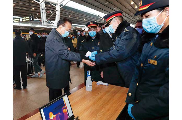 2月14日,中共中央政治局常委、國務院總理、中央應對新冠肺炎疫情工作領導小組組長李克強赴北京西站考察有序錯峰返程和新冠肺炎疫情防控工作。 (中新社圖片/ 劉震 攝)