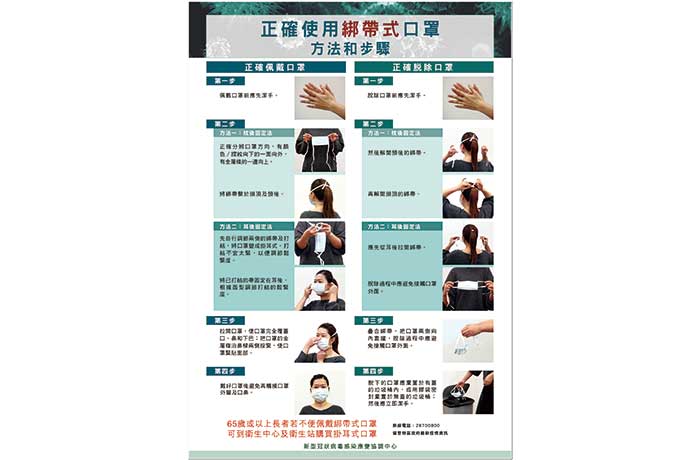 【特訊】新型冠狀病毒感染應變協調中心表示,正進行的第三輪保障口罩供應給澳市民計劃包含不同款式或顏色,而昨日起亦會有綁帶式口罩供應。綁帶式口罩一般應用於手術室,具專業防護功能,市民在使用上可能會不習慣,因此,協調中心會推出海報及視頻示範教學。而65歲或以上長者若不便佩戴綁帶式口罩,可到衛生中心及衛生站購買掛耳式口罩。