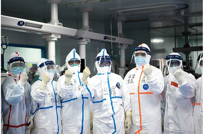 2月20日,中國工程院院士、國家衛健委高級別專家組成員李蘭娟在武漢大學人民醫院東院重症ICU病房查房,瞭解新冠肺炎重症患者治療情況。圖為李蘭娟院士(左四)和團隊成員在進入病房前加油鼓勁。 (中新社圖片/ 安源 攝)