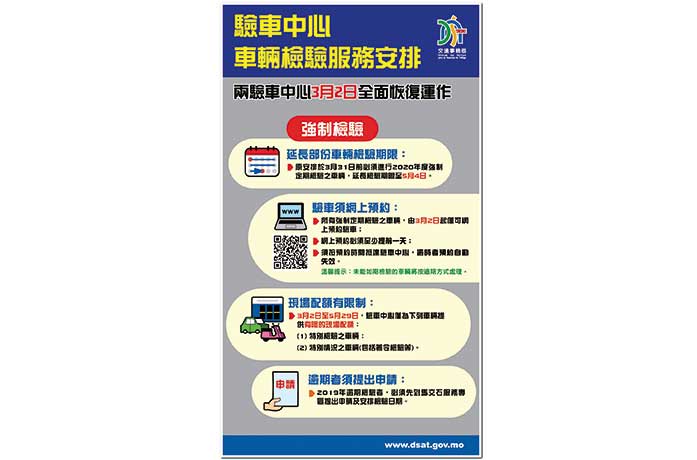 為舒緩巿民在驗車中心的輪候情況,所有強制定期檢驗之車輛於3月2日(周一)起,必須提前登入交通事務局網頁www.dsat.gov.mo進行預約檢驗時段,並於同日起可查閱可供預約之日期及選擇之餘額,有關數量將因應疫情發展作出調整;而每日上午10時起驗車中心僅為特別檢驗及特別情況(包括著令檢驗等)之車輛提供有限的現場配額,上述安排暫定至5月29日(周五)。