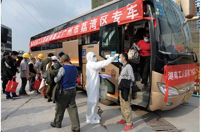 2月26日,廣州荔灣區“點對點”接送務工人員的三輛返崗專車抵達荔灣區一處項目工地,來自湖南省郴州市和廣西壯族自治區興安縣的80余名外來務工人員安全到達工作單位。圖為工作人員為務工人員檢測體溫。 (中新社圖片/ 姬東 攝)