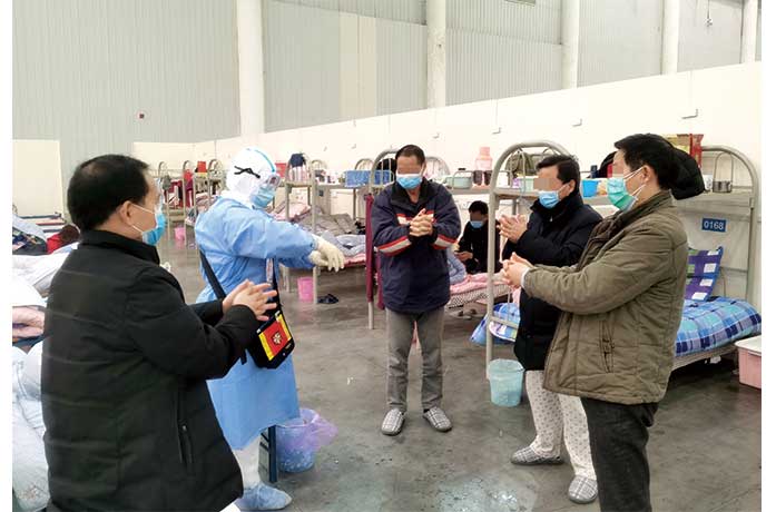 2月26日,武漢漢陽方艙醫院內,醫護人員向患者示範洗手消毒要領。漢陽方艙醫院位於武漢國際博覽中心,是專門收治新型冠狀病毒肺炎感染輕症患者的方艙醫院。 (中新社圖片/ 安源 攝)