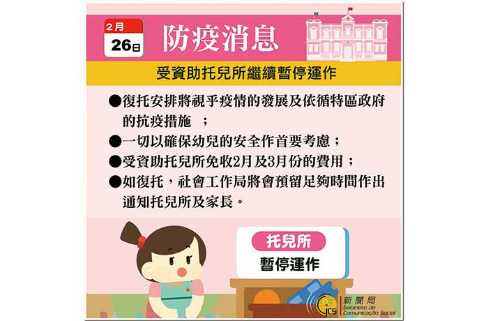 社工局已協調受資助托兒所免收二月份及三月份的費用,家長如已繳交,可在復托月份的費用中扣除。蔡兆源也表示,在將來復托前,社工局將會預留足夠時間向托兒所及家長作出通知,以便有關托兒所做好淸潔消毒、復課運作安全措施等各項準備工作。