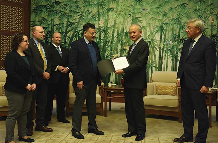 當地時間2月26日,中國駐美大使崔天凱在華盛頓應約會見美國猶太人公共事務委員會(JCPA)主席大衛•伯恩斯坦等美國猶太人組織主要負責人,並接受由JCPA等87個美猶太人組織共同發表的公開信。 (中新社圖片/ 陳孟統 攝)