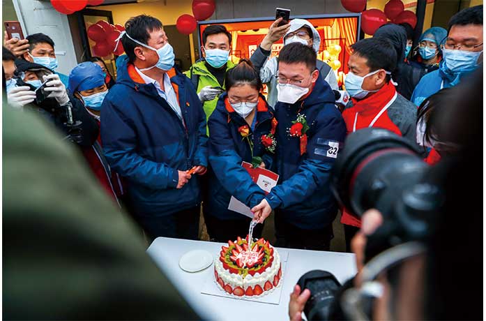 2月28日,在武漢雷神山醫院的辦公區舉行了一場特殊的婚禮。新郎新娘分別是25歲的于景海和24歲的周玲憶,他們都來自上海仁濟醫院的護士,10天前到達武漢,一直奮戰在抗疫一線。兩人原定於28日在上海舉行婚禮,如今,他們的婚禮地點變成了武漢雷神山醫院。圖為新郎于景海和新娘周玲憶在婚禮現場切蛋糕。 (中新社圖片/ 張暢 攝)