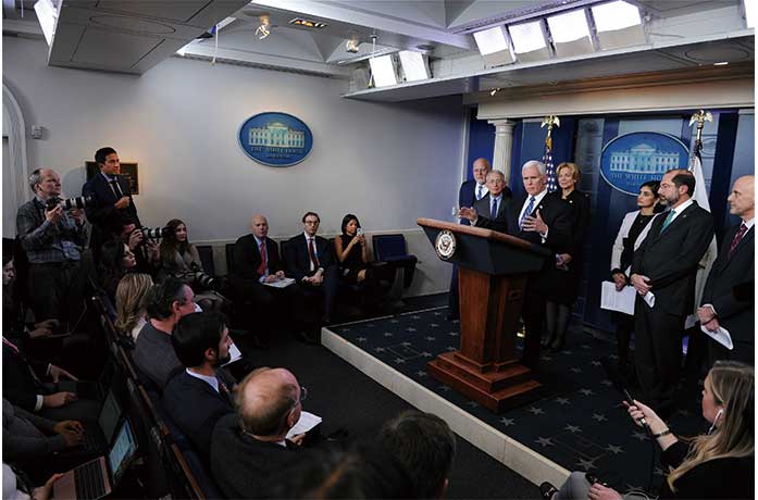當地時間3月2日,美國副總統彭斯在白宮新聞發佈會上表示,沒有任何關於限制在美國境內旅行的建議。新冠肺炎疫情在美國的風險仍然很低,人們應該用“常識”作出決定。(中新社圖片/ 陳孟統 攝)