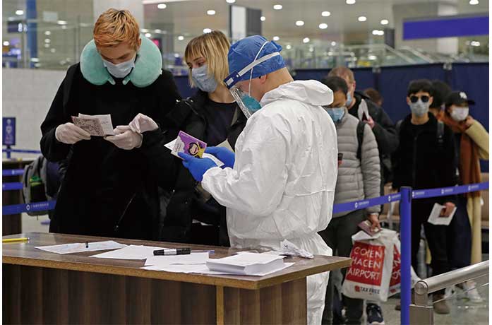 3月4日,上海海關在浦東國際機場對入境旅客進行健康申明卡信息核查。當日,在上海浦東虹橋兩大機場,上海海關從嚴從緊開展針對國際入境旅客的疫情防控工作,築牢防線,更加精準有效防控境外輸入風險。 (中新社圖片/殷立勤 攝)
